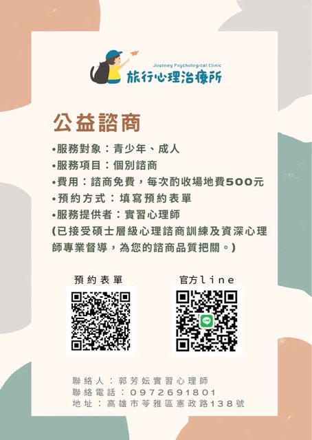 大家好! 旅行心理治療所目前有提供「公益諮商」的方案(地點近科工館)可以掃QRcod