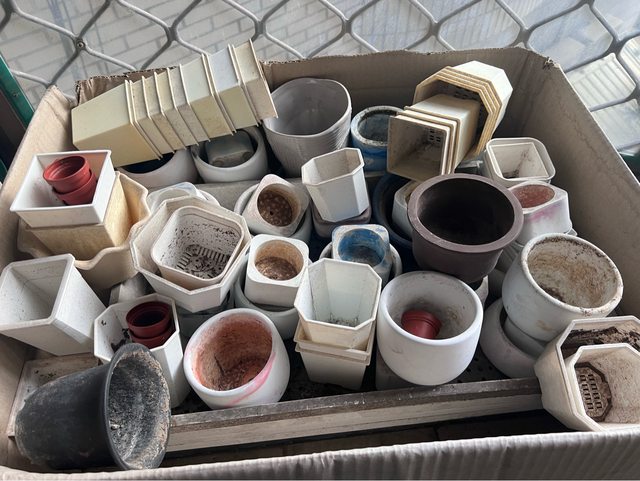 物品名稱:一堆二手盆器,有塑膠的也有自己做的水泥,還有育苗盤約四個