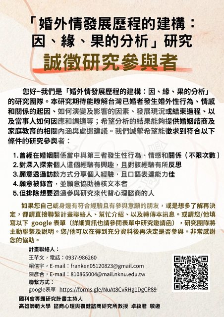 對當事人的影響等,期待能透過本研究,讓大眾更了解婚外性行為、情感和關係的發展歷