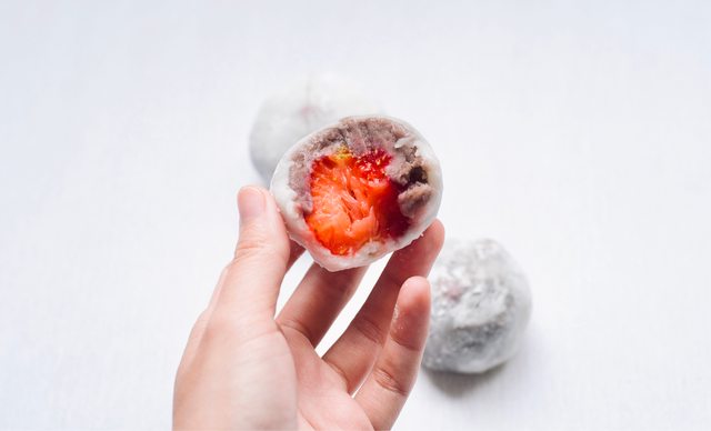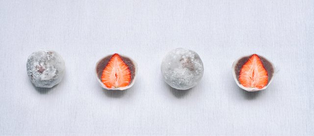 連最近開單賣的草莓大福,也是使用大顆草莓配上白玉粉搗成的大福皮與萬丹紅豆製成的