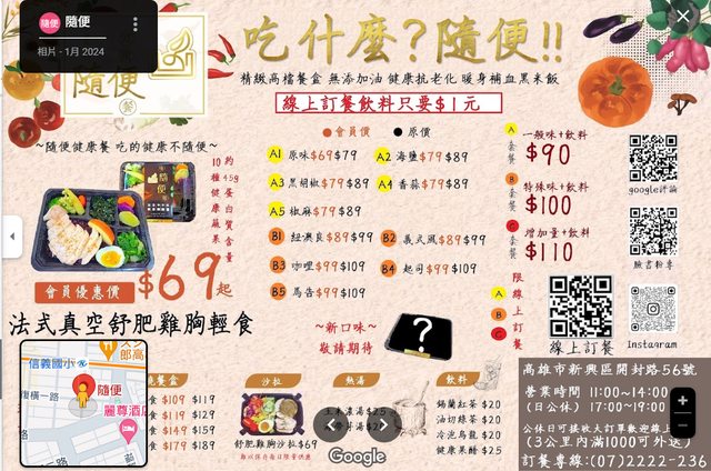 菜單上的菜色來看 最便宜的會員價69感覺還不錯 以健康餐來說算便宜的了 有機會會想去吃吃看看看到底好吃不好吃 -- ※ 發信站: 批踢踢實業坊(web-ptt.org.tw), 來自: 1.200.11.88 (臺灣) ※ 文章網址: https://web-ptt.org.tw/Kaohsiung/M.1705896753.A.D15