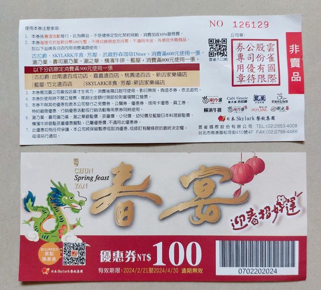 雲雀集團 餐飲折價券