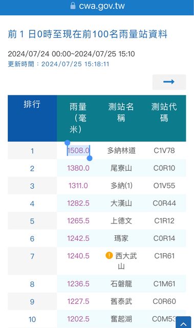 查看了1日前100名雨量站資料 發現第一名 高雄多納林道 1天1508.0毫米 請問 這樣有破台灣氣象局1天雨量 最高紀錄嗎? https://www.cwa.gov.tw/V8/C/P/Rainfall/Rainfall_Top100 https://i.imgur.com/GqsqPnP.jpeg