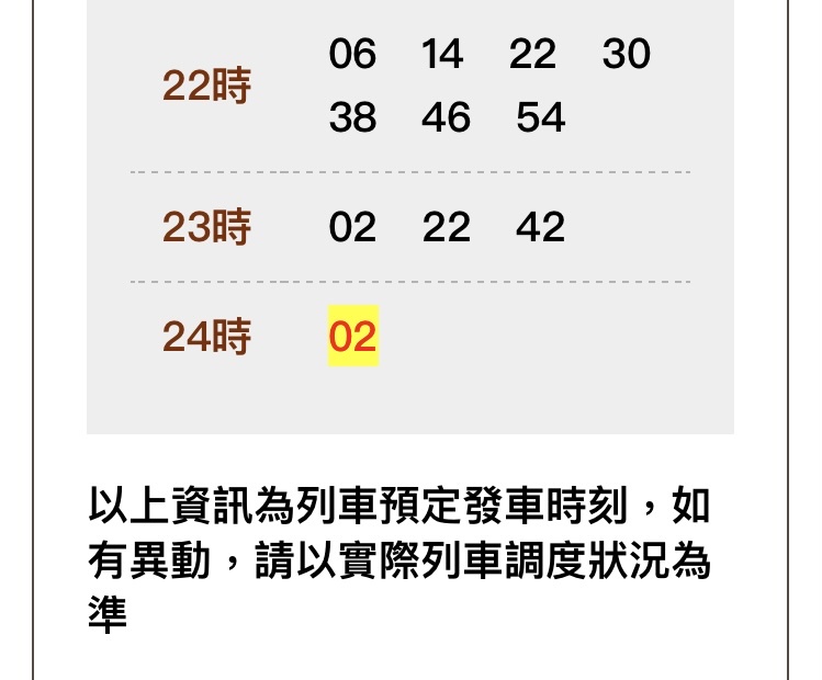 → PTTchiayi : 因為之前用23:30的乘車時刻還查的到車次,才覺得很 10/07 11:57