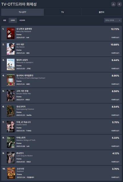 從電視劇話題度排名和市場佔有率來看,tvN《和我老公結婚吧》(12.72%,朴敏英、羅