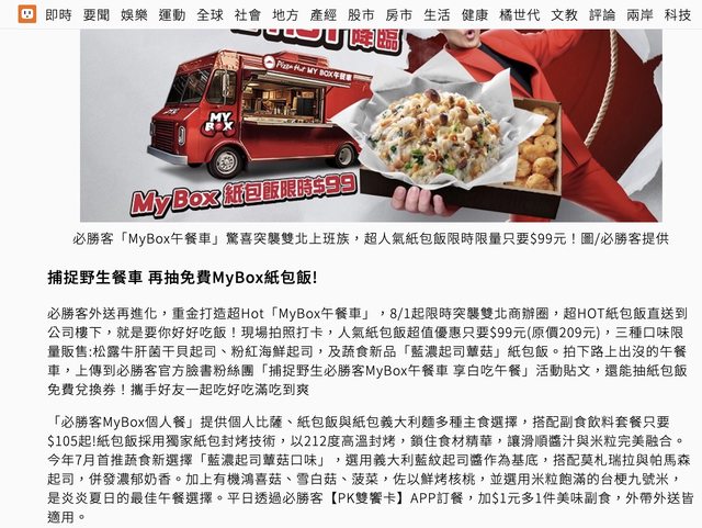 必勝客MyBox個人餐三種口味紙包飯 松露牛肝菌干貝起司、粉紅海鮮起司、藍濃起司蕈菇 原價209 現場拍照打卡優惠99 場次: 08/01(二) & 08/02(三) 12:00-13:30 東區商圈 台北市大安區忠孝東路四段170巷9號郵局斜對面 08/03(四) & 08/04(五) 12:00-13:30 東區商圈 台北市大安區光復南路131巷1弄36號對面 08/08(二) & 08/09(三) 12:00-13:30 遠東世紀廣場中庭 新北市中和區中正路726號C、D棟中間 08/10(四) & 08/11(五) 11:30-13:00 內科陽光街停車場 台北市內湖區陽光街381號旁 -- ※ 發信站: 批踢踢實業坊(web-ptt.org.tw), 來自: 219.68.45.66 (臺灣) ※ 文章網址: https://web-ptt.org.tw/Lifeismoney/M.1690808381.A.A65