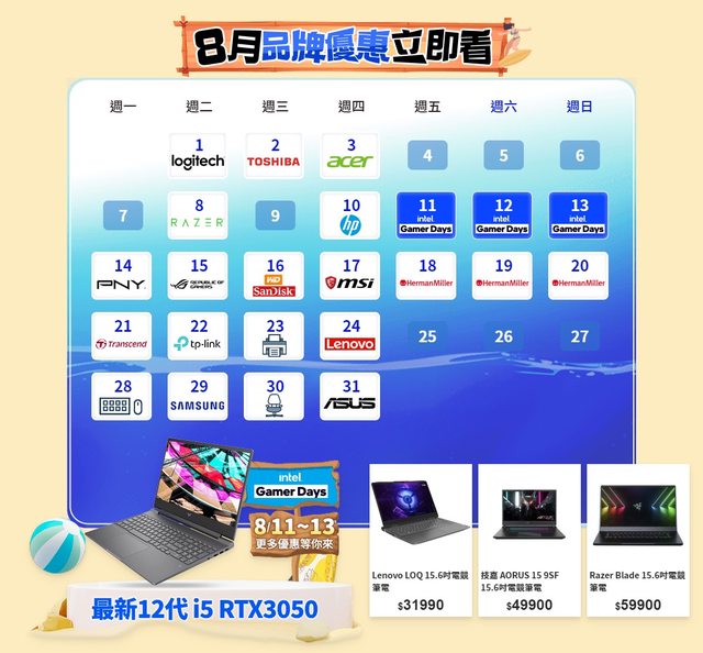 活動頁: https://reurl.cc/DAMYX5 重點整理: 1. 八月幾乎每天都有不同3C品牌的優惠 https://i.imgur.com/NIZkKQB.png