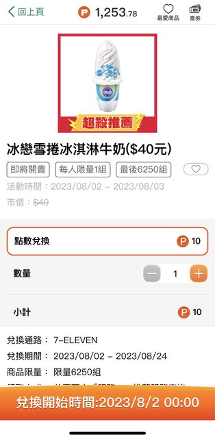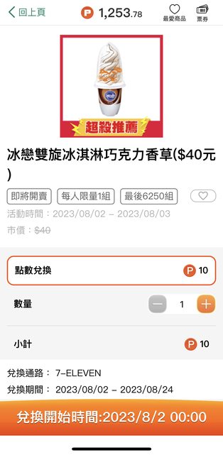 openpoint10點換 冰戀雪捲冰淇淋牛奶或雙旋冰淇淋巧克力香草 兩種各自限量6250組 兌換開始時間:2023/8/2 00:00 https://i.imgur.com/SUjdqjQ.jpg