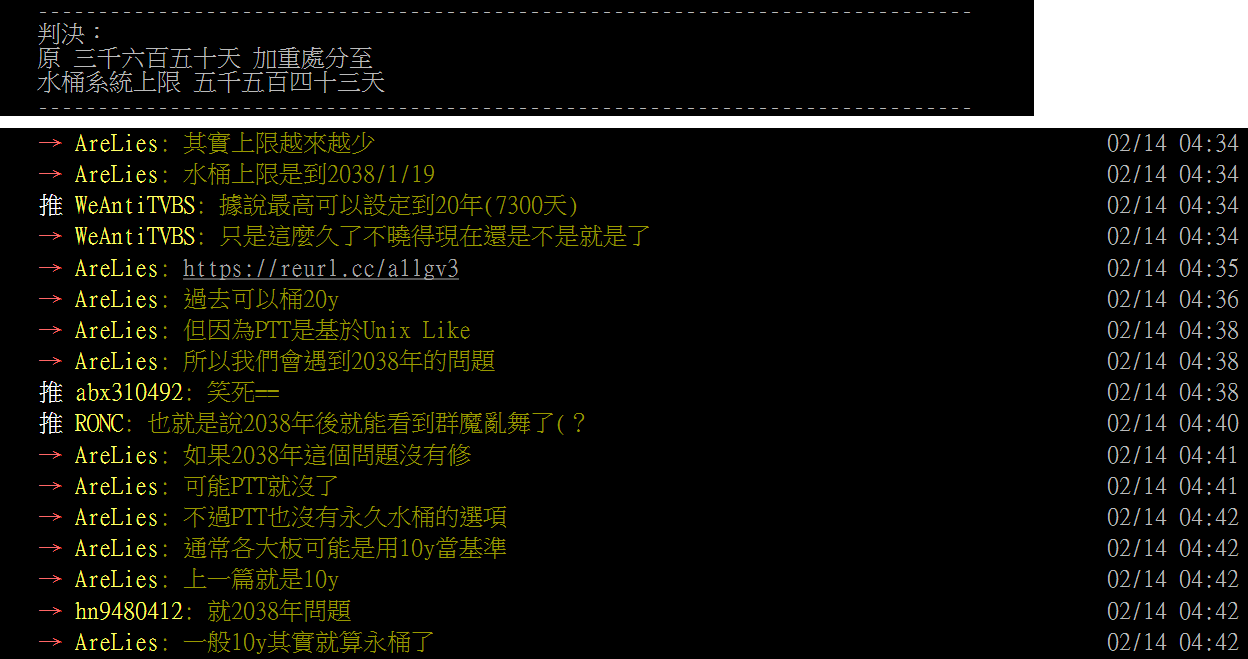 → DsLove710: PTT的水桶上限只到2038年1月18日 36.239.50.64 08/14 10:46