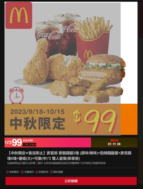 → MK47: 養的優惠 那才是麥當勞 大幅優惠一定是假的 36.235.197.184 09/21 19:30