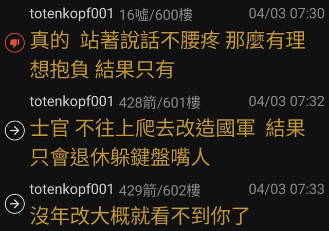 → totenkopf001: 士官 不往上爬去改造國軍 結果只會退休躲鍵盤嘴人