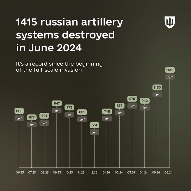 6月,1,415套俄羅斯火砲系統被摧毀。