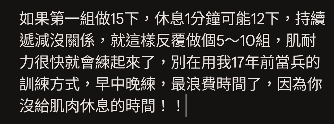 → Dwccc: 伏地挺身 因為重量不能增加,所以就要每組做到力竭。一天 03/19 17:41