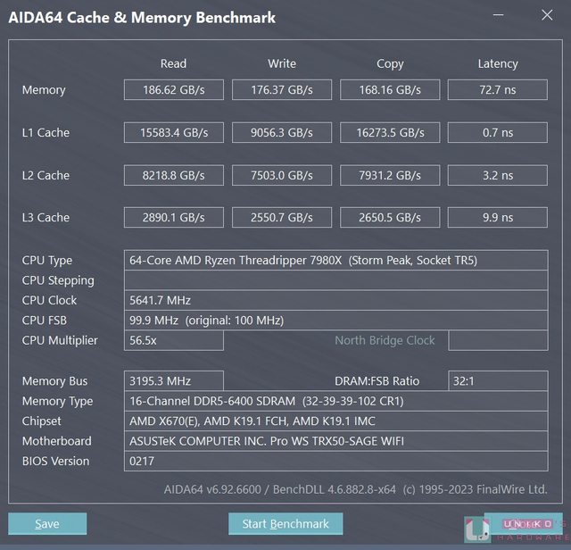 AIDA 64 的處理器和記憶體快取相關資料,記憶體頻率是 6400 MT/s,讀取 186.62 GB/s、