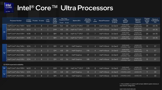 Intel Core Ultra支援筆電H與U系列型號,最高階Core Ultra 9 185H要等到2024 Q1才會