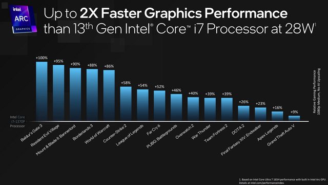 Intel Core Ultra 7 165H內建Arc GPU與上一代Core i7-1370P內顯效能對比。