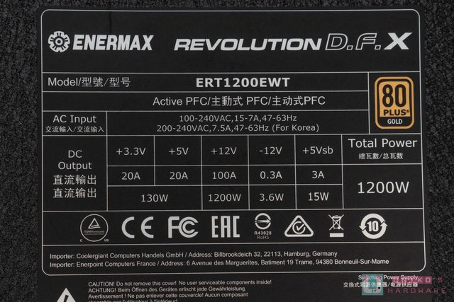 電供底部則是有一張貼紙,上面有印細部輸出規格,主要在 +12V、100A 下提供 1200W 輸