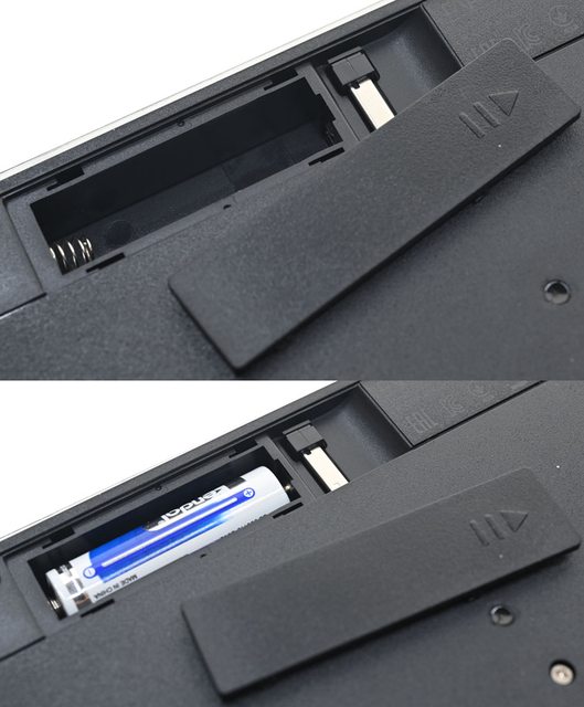 ▼鍵盤背面電池倉蓋打開後,有1個3號AA電池槽及2.4GHz無線USB接收器收納處