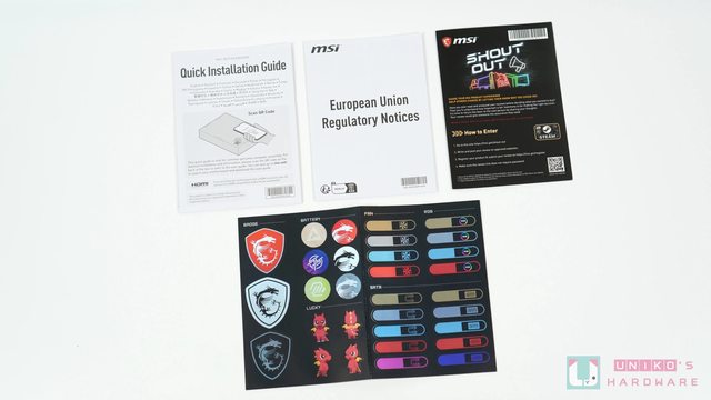 配件整體來說沒有特別加料,但說實話也夠用了,包含 1 張微星信仰貼紙、1 份歐盟規管