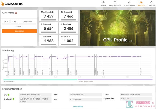 3DMARK CPU Profile,針對處理器的測試項目,6 個測試分別使用 1、2、4、8、16、或最