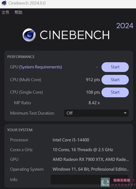 Cinebench 2024 單核心 108 pts,多核心 912 pts。