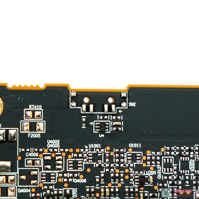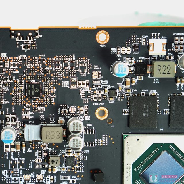 PCB 背後為金屬背板,提供散熱、保護、加固和美觀的功能。不得不提的是 SAPPHIRE 的黑