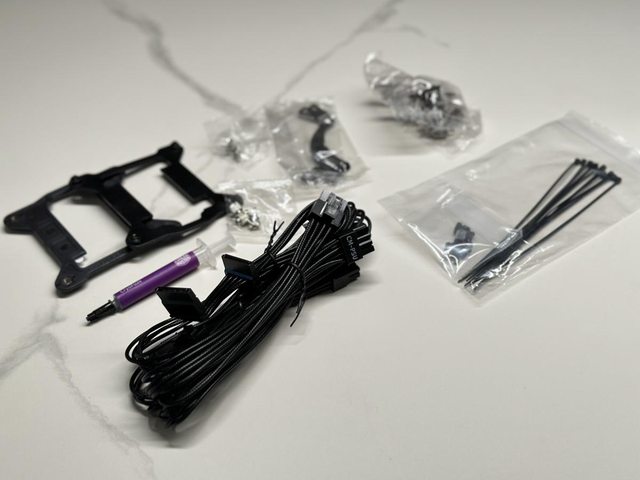 配件盒下層還有水冷扣具及裝機螺絲、束線帶及散熱膏等。