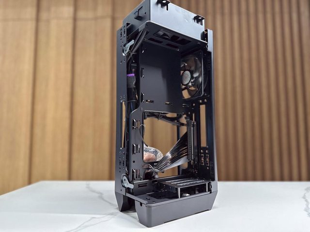 顯示卡與主機板為背對背安裝方式,各自從面板開孔進氣後,從頂部CPU一體水冷及側邊