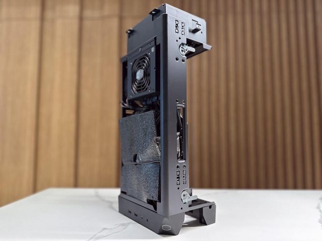 拆開兩個面板後可見類似開放式機架設計的本體,再拆除同樣是免工具的藏線板即可開始