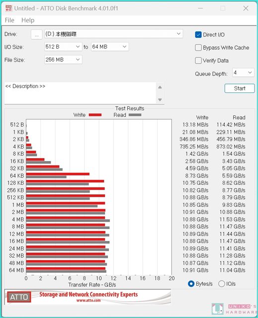 ATTO Disk Benchmark 4.01,寫入最高 10.91 GB/s、讀取最高 11.53 GB/s,IO 讀取區塊