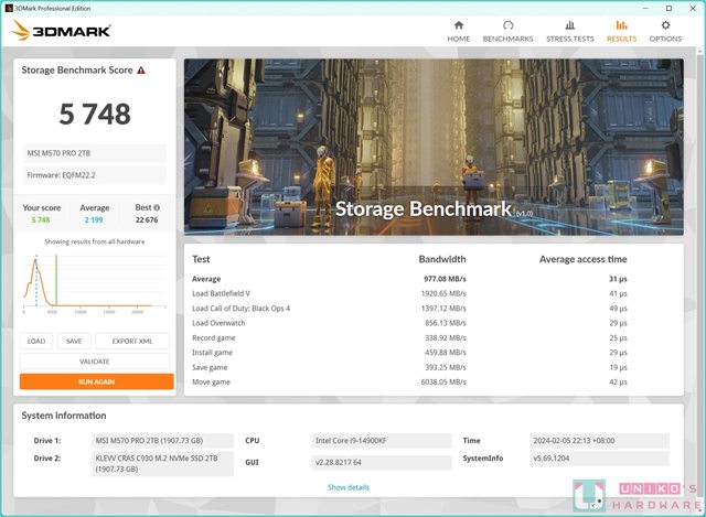 3DMARK STORAGE Benchmark 儲存裝置測試,平均頻寬 977.08 MB/s、跑分是 5748 分。