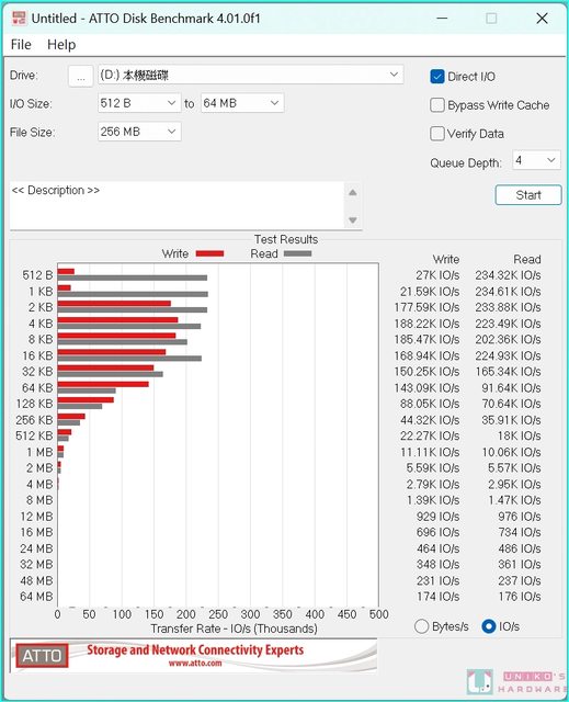 512 B ~ 64 KB 大約在 91.64 K IO/s ~ 234.61 K IO/s,IO 寫入區塊 512 B ~ 64 KB 大