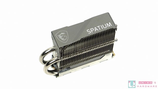 散熱器頂部有 MSI 龍盾 LOGO 宣示品牌信仰,右邊標示 SPATIUM 字樣,同時以一側磨砂,