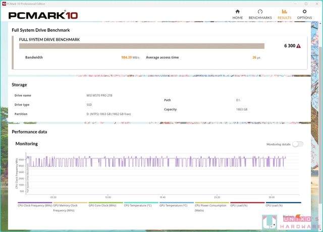PCMARK Full System Drive Benchmark 儲存裝置測試,測得頻寬 984.39 MB/s、平均存取