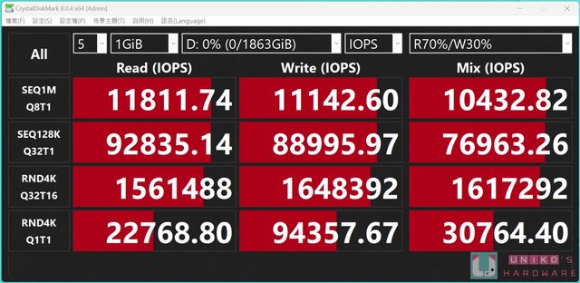 CrystalDiskMark 8.04 x64 IOPS 測試,Q8T1 讀取 11811.74、寫入 11142.60;Q32T1 讀