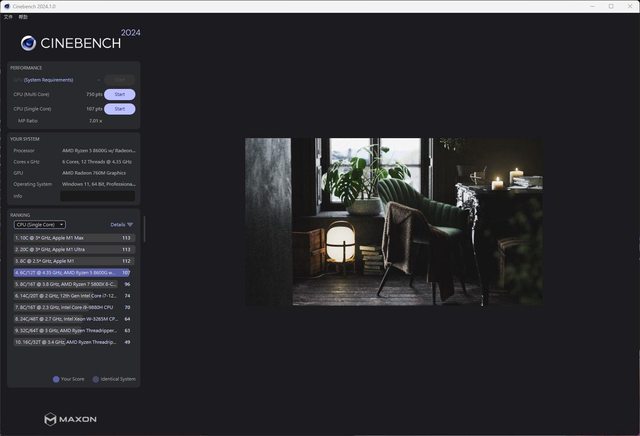 CINEBENCH 2024 測試,多核心為 750 pts ,單核心為 107 pts 。
