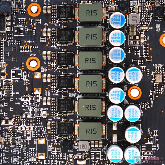 AMD 公版 PCB 的一大特色當然是把主要的輸入電容 (固態電容) 放在 PCI-E 8-PIN 之下,