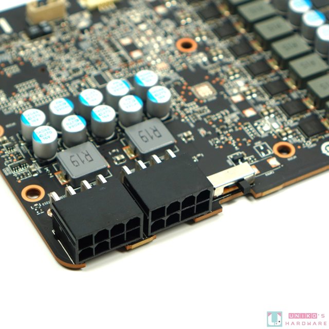 維持雙 PCI-E 8-PIN 輸入,旁邊還有一個實體切換,控制風扇和背板暗黑犬的發光顏色,P