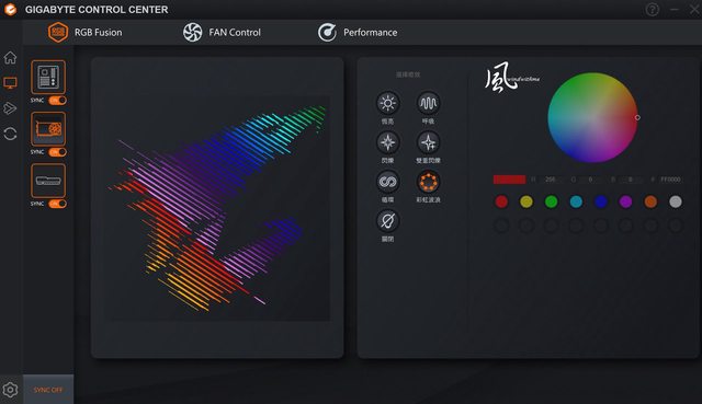 開啟專屬GIGABYTE CONTROL CENTER軟體,RGB FUSION頁面提供6種燈效模式。