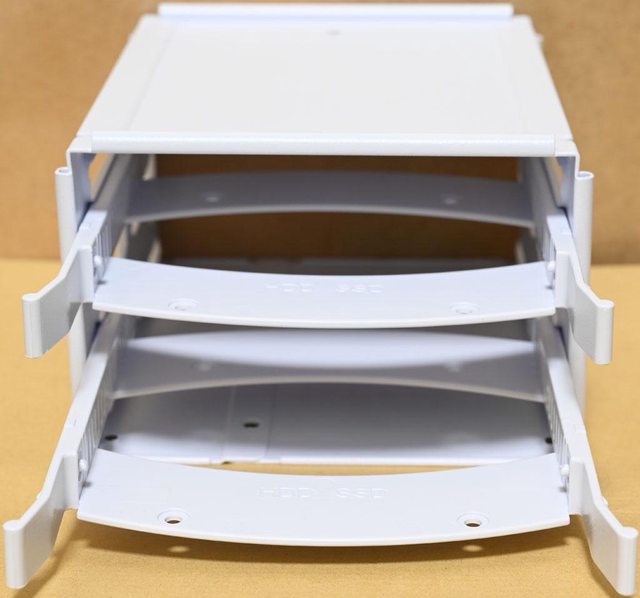 ▼右側側板卸除後的樣子,配件透明整理盒放在底部3.5吋/2.5吋抽取式固定架托盤上