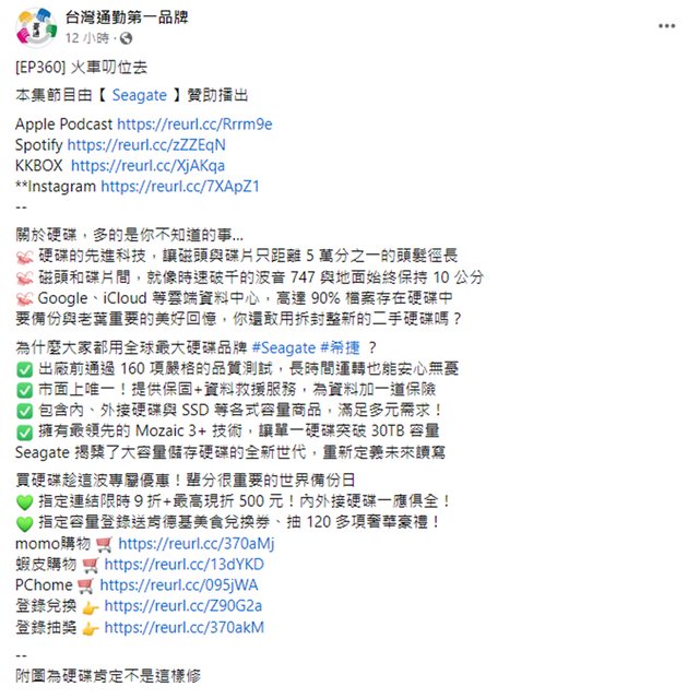 剛好聽到台通的Podcast在分享 就順便丟上來 總之就是如果透過台通的指定賣場 購買seagate的硬碟的話 可以有9折的優惠(上線折500) 不過賣場只有外接跟內接硬碟,沒有SSD 但如果最近有需要擴充電腦容量 或者需要移動儲存設備的的還是可以參考一下。 https://i.imgur.com/lBAulaa.png