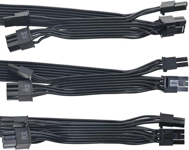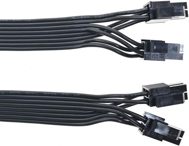 ▼3條顯示卡電源黑色帶狀模組化線路,提供6個PCIE 6+2P接頭,至第一個接頭18AWG線路