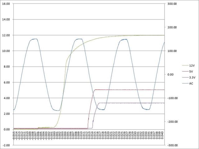 ○電源啟動至綜合全負載輸出狀態,12V上升時間33ms,5V上升時間3ms,3.3V上升時間
