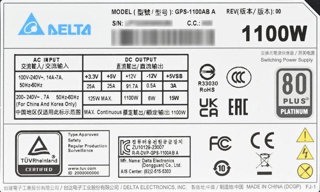 ▼本體背面標籤有Delta商標、GPS-1100AB A型號、版本、序號/條碼、1100W輸出功率、