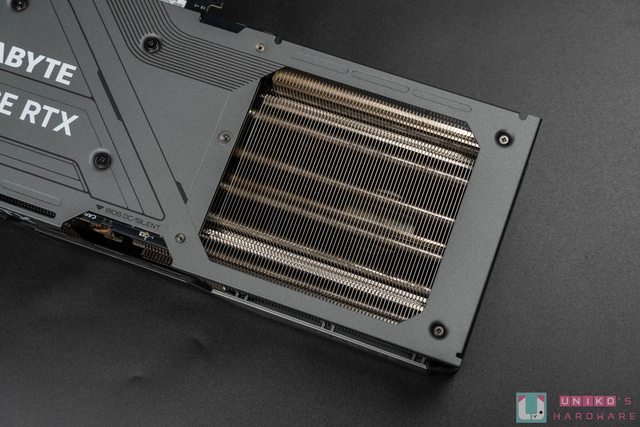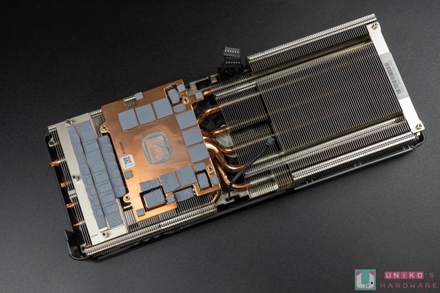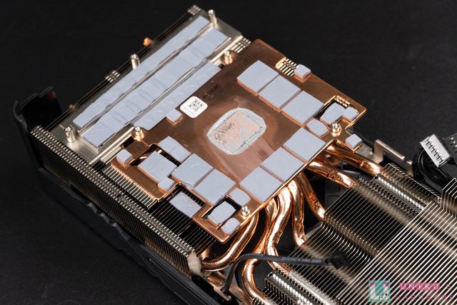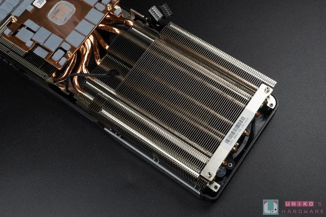 底部同樣能看到大面積散熱鰭片,並且此處隱約可見內部散熱銅管,共有 8 根高效能銅熱