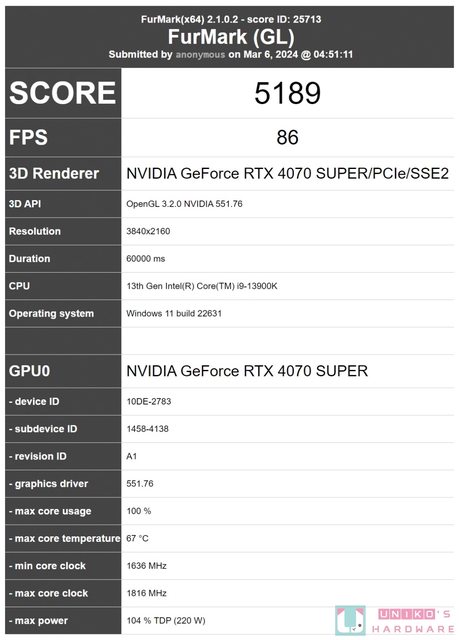 另外以最新的 FurMark 2 做 4K 模式測試跑分,獲得 5189 分、86 FPS。