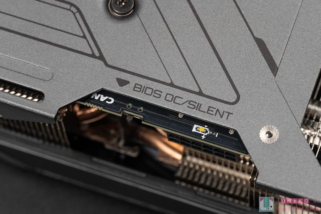 顯示卡頂部可見大面積散熱鰭片,中央為 PCIe 16pin 供電接頭,雙 BIOS 切換開關也位於