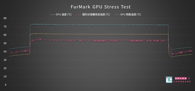 以 30 Min FurMark 壓力測試作為指標,前後有 5 Min 待機,室溫控制在 26℃。GPU 溫度