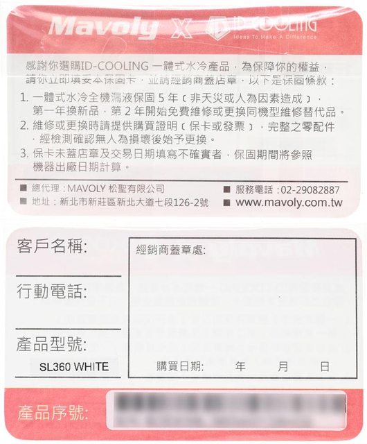 ▼保固卡,正面有保固條款說明及代理商聯絡方式,背面的登錄欄位有客戶名稱、行動電