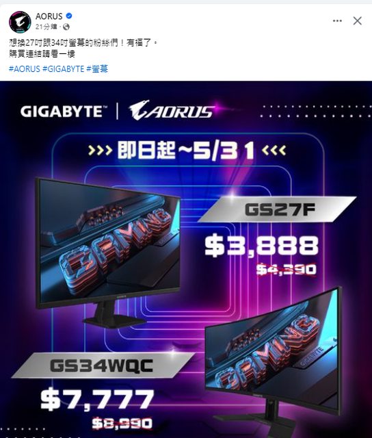 標題[情報] 技嘉G27F + GS34WQC 特價